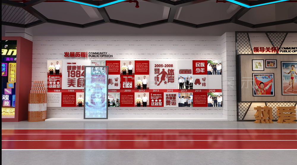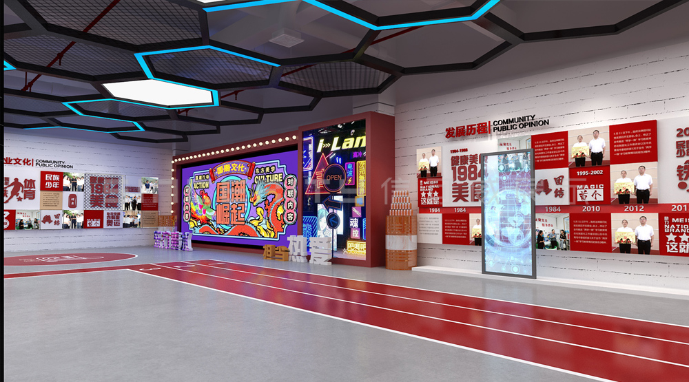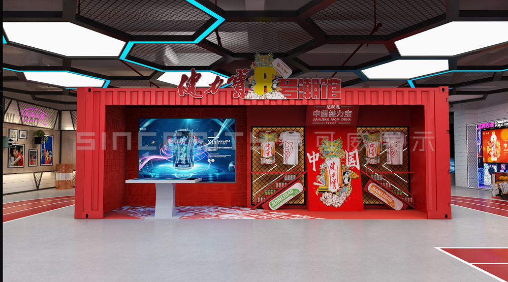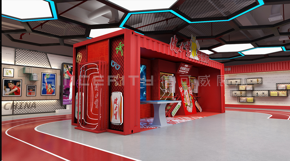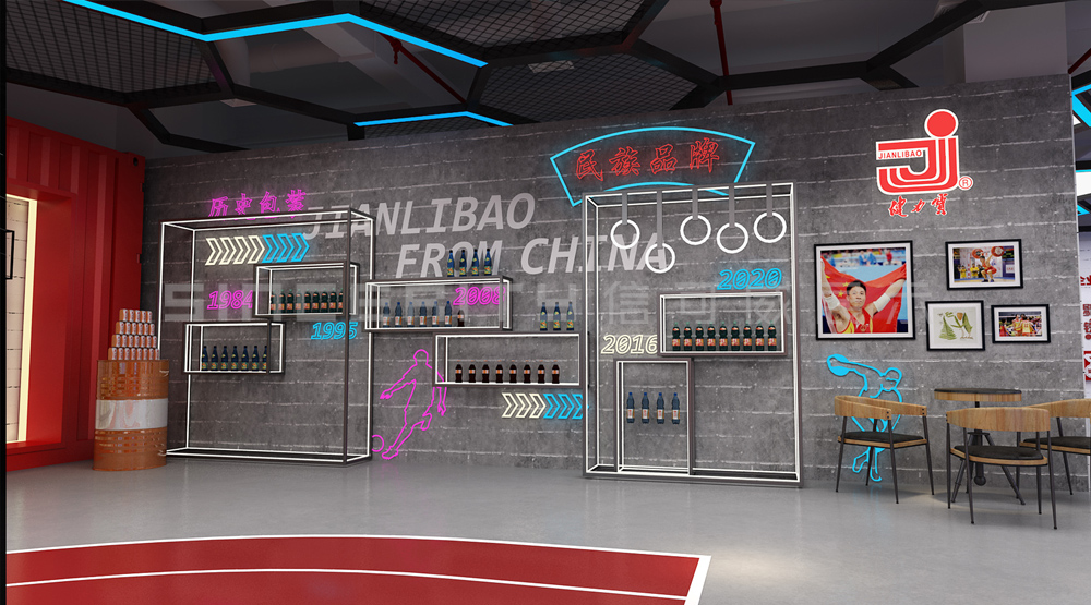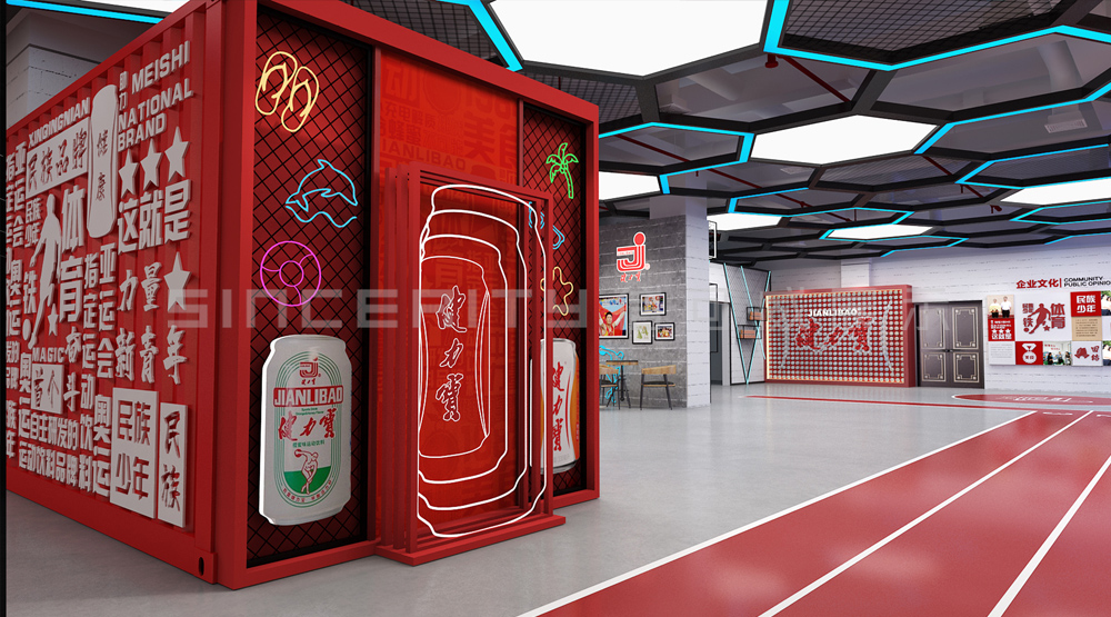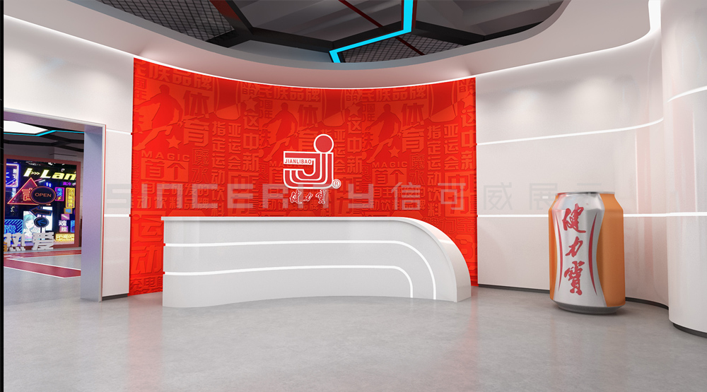 健力寶主題展覽館改造設計項目,信可威的設計方案以“科技感、現代感、互動感”為主,貼合健力寶品牌主色調“中國紅”,融入健力寶企業文化,簡單的增加國潮性元素,同時凸顯了體育品牌,增加了互動體驗區拍照區,加強互動體驗感,給參觀者留下深刻印象。