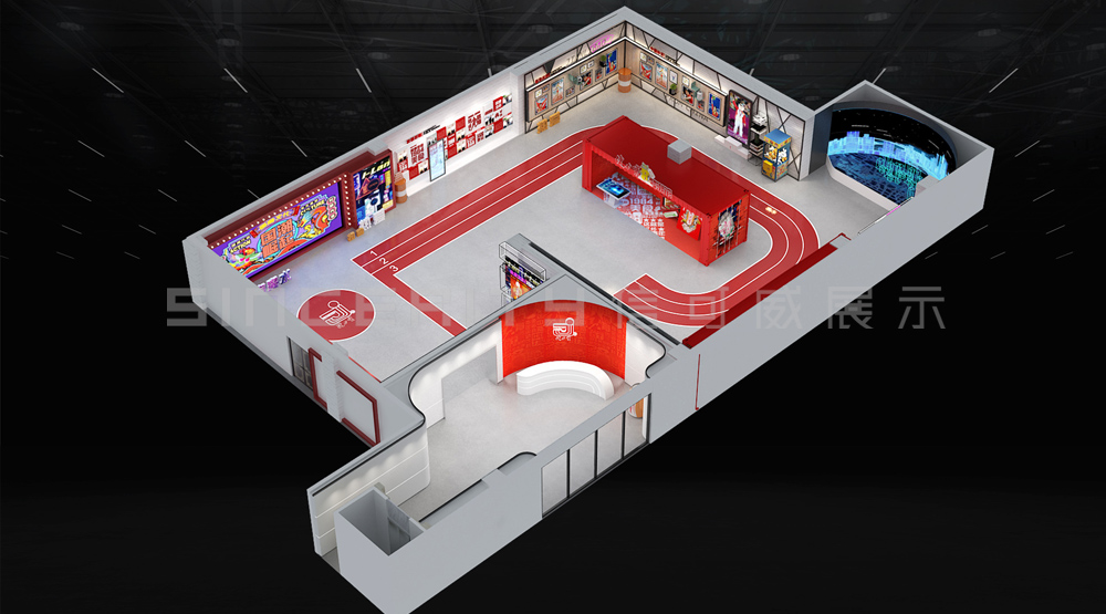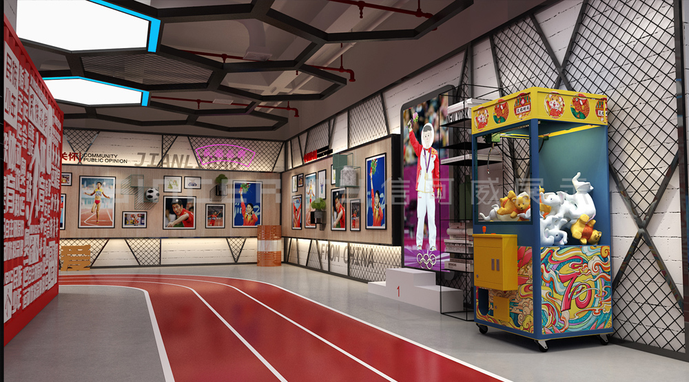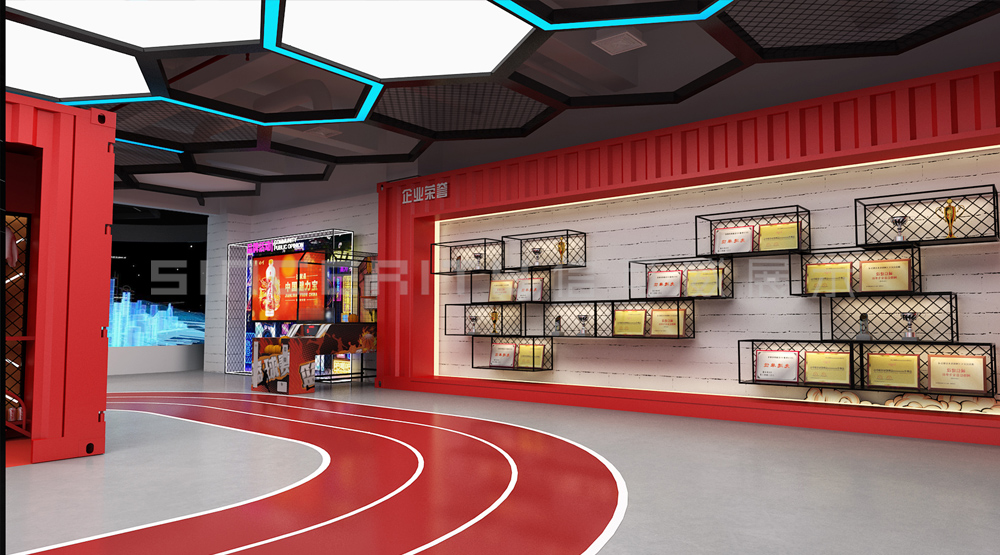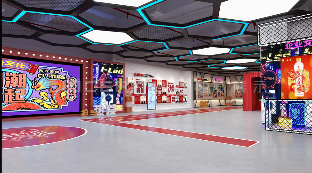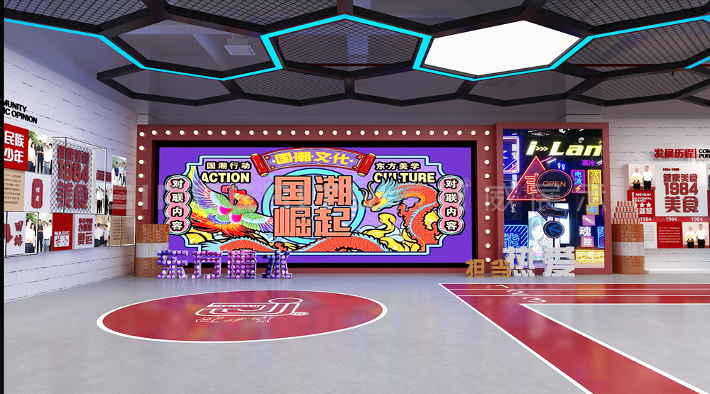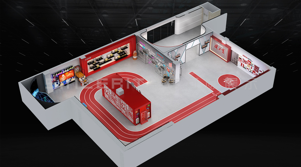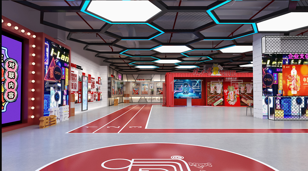 健力寶主題展覽館改造設計項目,信可威的設計方案以“科技感、現代感、互動感”為主,貼合健力寶品牌主色調“中國紅”,融入健力寶企業文化,簡單的增加國潮性元素,同時凸顯了體育品牌,增加了互動體驗區拍照區,加強互動體驗感,給參觀者留下深刻印象。