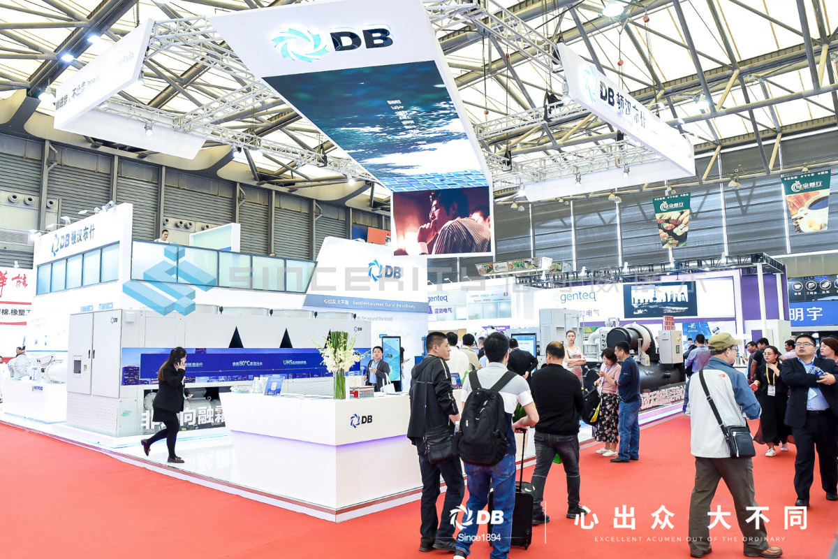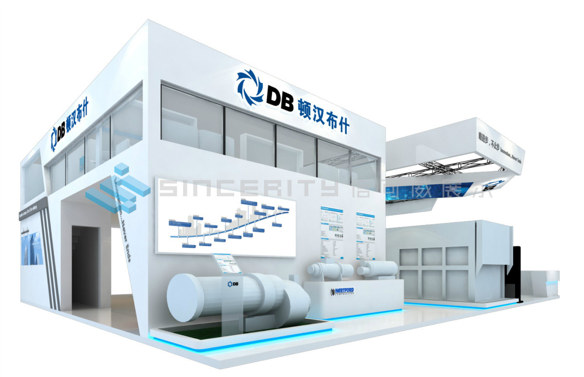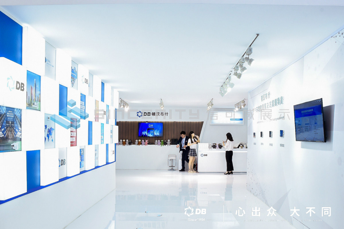 DB頓漢布什展臺(tái)設(shè)計(jì)以白為主色,藍(lán)色為輔色,展臺(tái)中央采用高科技折屏,著重突出DB品牌和產(chǎn)品的展示,契合DB全球品牌戰(zhàn)略的輸出,將情懷與科技融為一體。